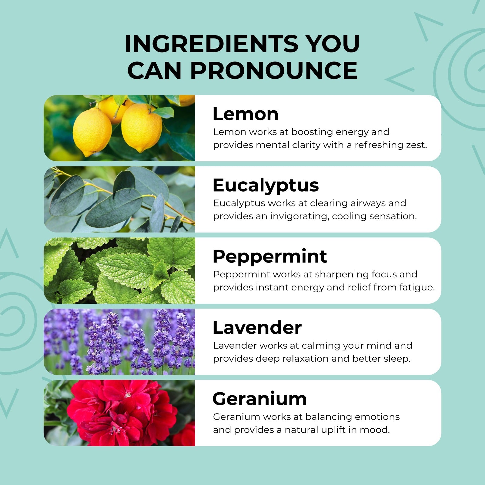 • Boosts energy levels with refreshing menthol and citrus oils.